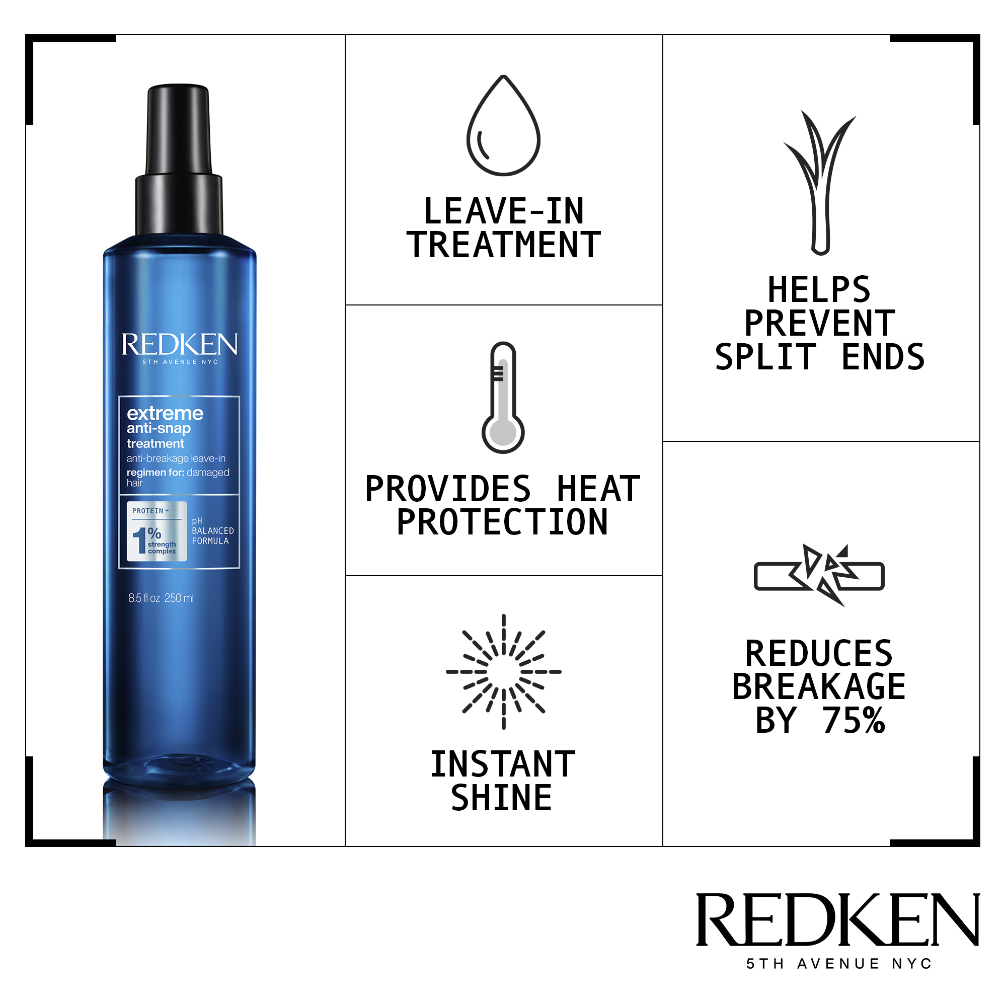 Redken Extreme Anti-Snap leave in conditioner gently smoothes the hair cuticle to help prevent hair breakage and fortify damaged hair. Anti-Snap is formulated with Redken’s Strength Complex and acts as a deep conditioner, reducing friction from brushing and preventing further damage, leaving hair healthy, shiny and resilient. Anti- Snap provides 75% reduction in breakage when used a system of Extreme Shampoo, Conditioner and Anti-Snap.